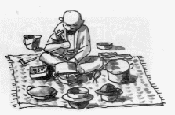 25)いかけ屋 いかけ(鋳掛)屋が、リヤカーなどを引きながら、「いかけ、いかけ・・・」と、町内を一巡し、いつも商売を始める場所の道端に道具を並べて、客待ちをします。 当時は、鍋・釜・金だらいなど、小穴があいたりすると、今では廃棄してしまう品物でも、このいかけ屋に修理してもらって、物を大事にする時代でした。 いかけ屋は、小孔のあいた金物に、しろめ(白臘)はくろう といった“はんだ”を溶かし込んで、孔を塞ぐのです。その後で、塞ぎ具合を太陽の方に向けて確かめ、更に水に浸してでき具合を見たりしました。その頃、このいかけ屋は、人々にとって便利な存在だったと言えます。 江戸時代の文化末年の頃、大阪に夫婦連れで歩きながらの鋳掛屋があったのを、三代目中村歌右衛門が、これをモデルにして芝居をしたことから、夫婦一緒に歩くことを「いかけ」とも言われます。 私などは、母に「これを、いかけ屋さんにもっていきな!」と言われ、頼んでから、順番くるまでの間、修理の様子が面白くて見ていたものです。自分の修理が終わると、母に連絡し、代金を払ったものです。 どちらかというと、いかけ屋さんは、商人の中で、無口で愛想のない人という印象を受けています。 その外、修理のような商売で来たのが、ラオのすげかえ屋、(キセルの修理)、とぎ屋(刃物などをとぐ)、のこぎり屋(のこぎりの目立て)、下駄屋(下駄の歯を入れかえたり、鼻緒のすげかえ)などがありました。 |