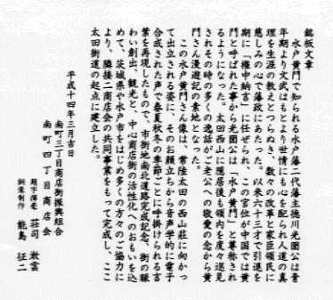 ここに、商店街共同施設整備事業として、茨城県、水戸市に補助金申請を行い、商店街の基金を加え、尚且つ彫刻家・能島征二先生及び、題字揮蒙に書道家・荘司漱雲先生に多大なご協力を頂きながら鋭意進めてまいりました。