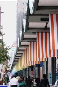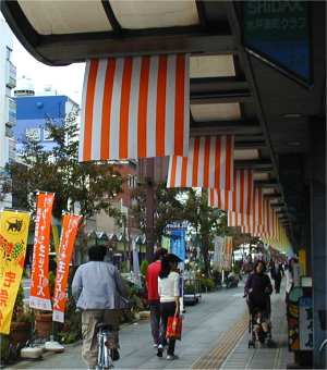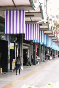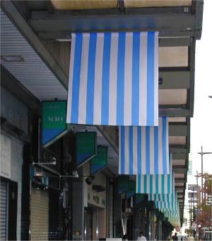 | 南町三丁目商店街アーケード・虹色のストライプフラッグの作品は、1996年8月6日(火)〜10月20日(日)の会期で水戸芸術館現代美術センターにて開催された企画展「ダニエル・ビュレンヌ 透きとおった光」の関連企画プロジェクトとして製作し、展示された作品です。 今回、カフェイン・水戸2008の企画として12年ぶりに2度目の展示となります。 ビュレンヌは、1938年フランス、パリ生まれ、「視覚の道具」と呼ぶ幅8.7pのストライプの布を使って世界を彩る、フランスを代表する作家です。 街中に賑わいを創出し、「誰とでもコミュニケーションできる行動」というコンセプトにより、再び展示されております。 (協力・・水戸芸術館現代美術センター) |
